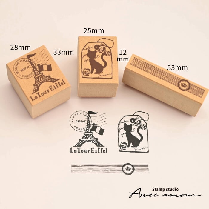 商品明細素材:エコウッド・天然ゴムスタンプサイズエッフェル塔 33mm×28mm×23mm黒猫のタグ 33mm×25mm×23mm王冠の封印 12mm×53mm×23mm
